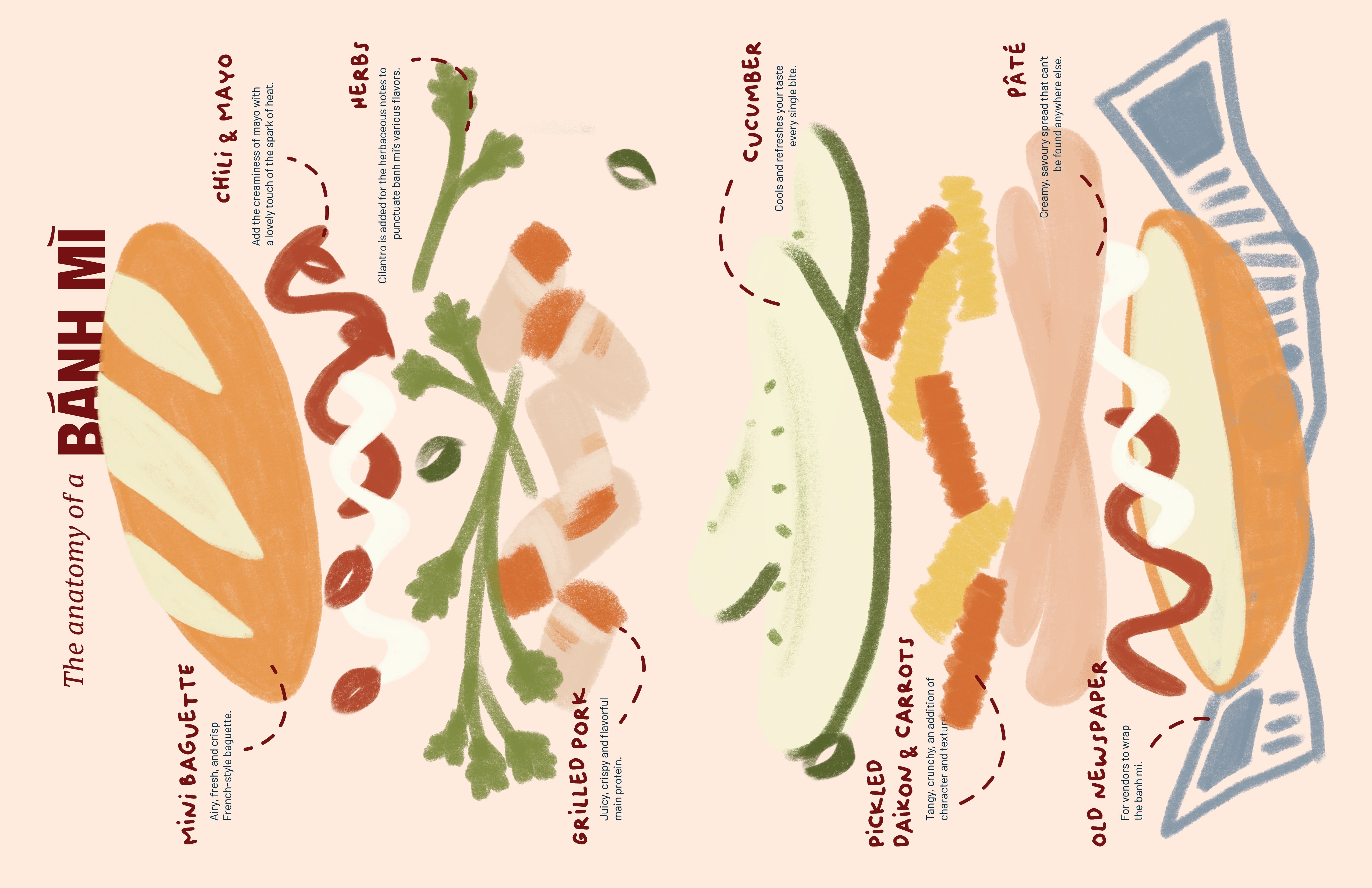 To bring the stories to life, I created hand-drawn illustrations inspired by the dishes mentioned in the articles, many were also dishes I grew up eating. This personal connection infused the visuals with authenticity and emotional depth, bridging the gap between memory, culture, and design.